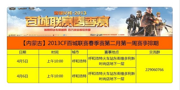 亲爱的XDJM们,2013年4月5日至6日内蒙古2013百城联赛春季赛第二月第一周周赛将于呼和浩特市隆重开启!2012已经过去,我们迎来了崭新的2013,2013CF百城同样给您带来新的期望,只要报名参赛就会获得翔龙M4A1/7天+百城联赛参赛名片/7天,更有稀有黄金道具送不停,CFER们准备好了吗?行动起来,放飞您的梦想实现CF三亿鼠标的冠军梦就在2013CF百城联赛春季赛内蒙古站!