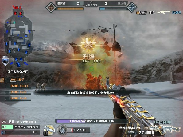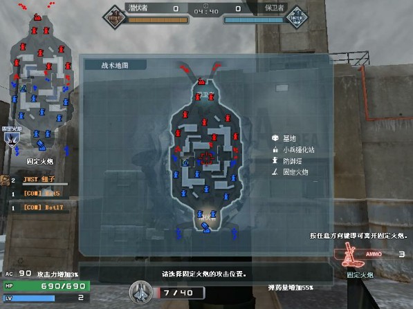 3分40秒会有火炮的空投信息,第一次火炮极其重要,后面第一次的小兵强化机会也非常重要!游戏过程中要时刻留意空投提示和敌方防御塔的大致血量,占领时间耗时有点长,第一时间成功占领火炮后要赶紧使用,避免还没用火炮自己就被敌方消灭的悲**况出现。 “战术地图”中很容易找到敌方的防御塔位置,最好能2~3发炮弹都只打一座防御塔,先把侧翼的敌方防御塔轰掉,这样可以大大鼓舞我方士气。一旦占领固定火炮,敌方是无法占领的,但是可以被消灭,所以一定要把握这个难得的机会!