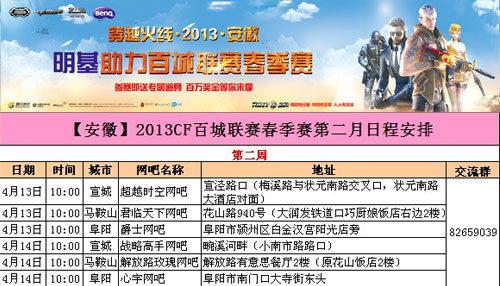 【安徽】2013CF百城联赛春季赛第二月第二周日程安排: