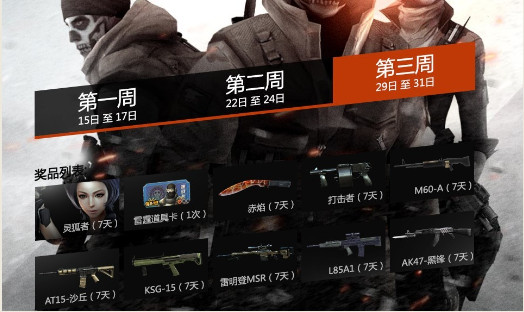 在活动期间,玩家在规定的时间内登陆游戏时长达60分钟以上便可以参与抽奖,参加三日活动便可以赢取三次抽奖机会。雷豹、血影、AK—黑锋、雷霆道具卡等给力道具全部纳入奖品之列,让玩家在酣战游戏之后还可获得给力的道具奖励。