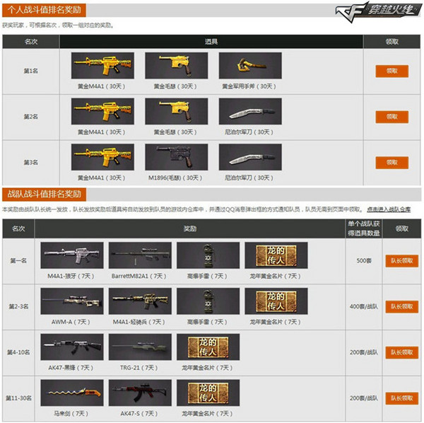 本次比赛将分个人排名和战队排名,将根据当前获得的战斗值进行排名。个人排名前三的玩家将获得30天黄金M4A1、黄金手斧、黄金毛瑟、尼泊尔军刀等豪华礼包;战队排名前三的战队可分别获得500套冠军奖,400套豪华奖,200套丰富奖。另外,战队战斗力值达到40000分的战队都可领取50套改名卡、毛瑟手枪以及军用指虎;连续参赛三天以上的玩家还可获得扳手、灵狐者等热门道具。大量礼包发放,助CFer们赛场一展风采,回馈玩家的参赛热情。