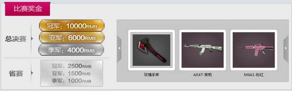 CF为参赛选手准备了丰厚奖励,晋级月赛的三甲队伍,将获得包括茉莉AK、PinkM4A1、玫瑰手斧在内的7天道具。晋级省赛的三甲队伍,将获得包括茉莉AK、PinkM4A1、玫瑰手斧在内的30天道具,除此之外还将获得千元现金奖励。最终问鼎全国冠军杯总决赛的三甲队伍,将分别获得10000、6000、4000元的现金奖励,鼓励在战场第一线奋战的男女玩家,为他们的精彩配合而喝彩。