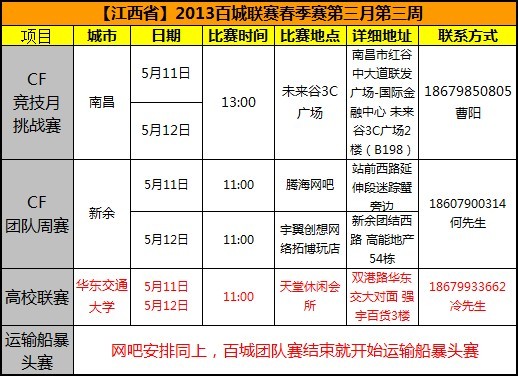 “启力杯”2013百城联赛春季赛第十一周周赛开始了,本周将在南昌、新余举行,本周主题月将是运输船爆头赛。另外还有竞技月挑战赛、高校联赛等着大家。赶紧擦亮手中的枪支来参与到比赛中来吧!