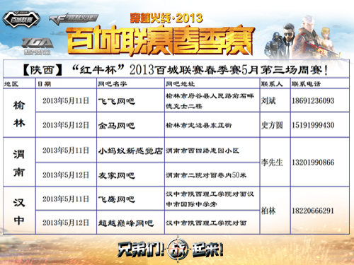2013年5月11日至12日,渭南,汉中,榆林三地开战穿越火线百城联赛春季赛第三场周赛!为了提高广大玩家的参赛热情,本届比赛凡是到场参赛的玩家们均可获赠红牛饮料!