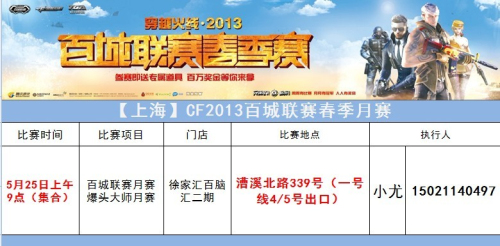 【上海赛区】2013年CF男女5v5混合赛,火爆开启,将从激烈的比赛中出线了6支队伍晋级省赛!还在犹豫什么呢?!展示你的风采,展示你的魅力! CF百城春季赛第3个月第3场周赛赛点揭晓: 【报名方式】: QQ群报名:92192476《上海》CF2013百城联赛 电话报名