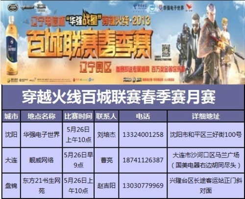辽宁电信“华强战皇”百城联赛春季赛辽宁赛区5月月赛重磅来袭,将于5月26日在辽宁沈阳、大连、盘锦三城市进行。沈阳CF百城联赛本周继续在华强电子世界沈阳店三楼至酷游戏体验区进行,本周将是本春季赛最后一场月赛,让我们一起为这些“战士"加油吧! 【大连】穿越火线2013