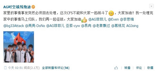 “家里的事情事发突然必须回去处理,这次CFS不能和大家一起战斗了,大家加油!我一处理完家中的事情马上归队,我们再一起征战。大家加油!”