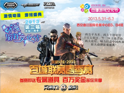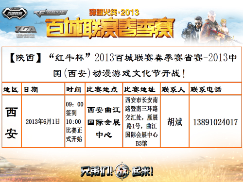2013年6月1日至2日,西安市开战穿越火线百城联春季赛陕西省省赛!在经历了为期三个月的激烈争夺,我们终于迎来了CF百城联赛的陕西省省赛,这万众瞩目的一刻,CFer会以什么样的状态亮相呢?期待你们的到来,百城联赛春季赛烽烟再起,激情盎然的战场为你开启,鼓足你的勇气,来和你的队