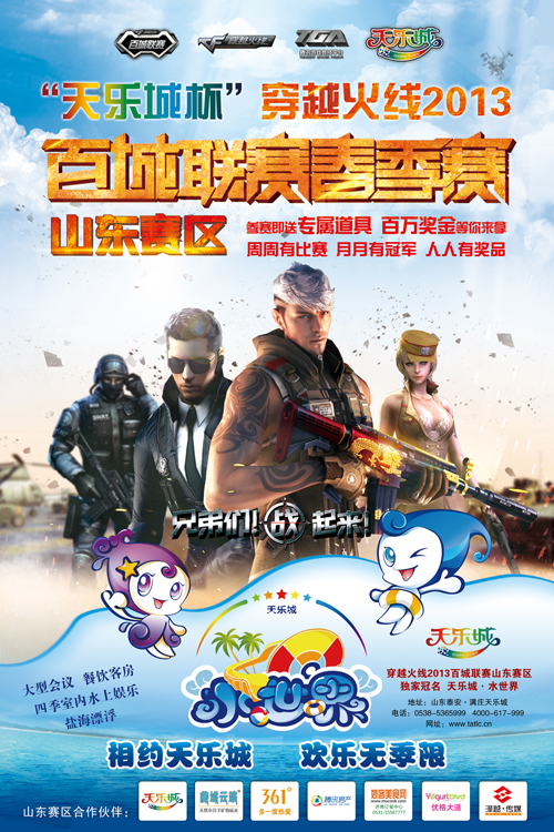 2013年“天乐城杯”CF百城联赛春季赛山东赛区,由天乐城水世界独家冠名,藏域云路天然小分子矿物质水、361°多一度热爱、腾讯房产济南站、妙客美食网全力赞助,一起打造最精彩的百城联赛!相约亚洲最大的室内水上世界——天乐城水世界;决战天乐城,有你更精彩,共同期待下个赛季的对战!