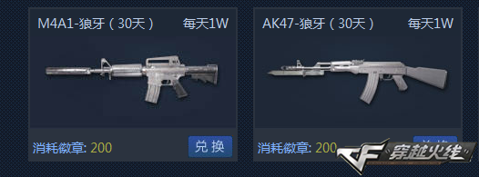 除去预约活动,玩家每日完成60分钟游戏还可领取狼牙徽章,连续3天完成任务可以领取额外徽章,5天以上更有5倍徽章收益。活动将有两把炫酷的狼牙武器,耀眼银色外观的“M4A1-狼牙”,稳定性和战斗力相当出色,“AK47-狼牙”银白高亮的外观让它发出慑人的寒光,超强弹夹,高火力输出,是爆破团队竞技的首选,每款武器时限为30天,足够CF玩家high翻天,同时barrett-战龙和黄金AWM也在奖品之列,玩家兑换即可得!