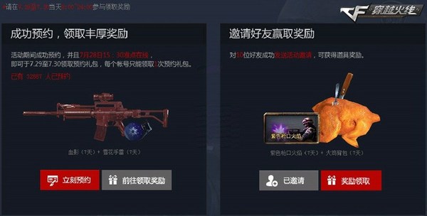 7.28狂欢活动开始之前的7月22日至7月27日,玩家在活动页面可以预约狂欢活动。预约成功的玩家可在活动结束后领取绝版武器M4A1-血影和雪花手雷;同时还可邀请好友参加预约活动,对10位好友成功发送邀请,就可领取个性道具紫色枪口火焰和火鸡背包。动动手指就可获得给力游戏道具,狂欢庆典从预约开始。