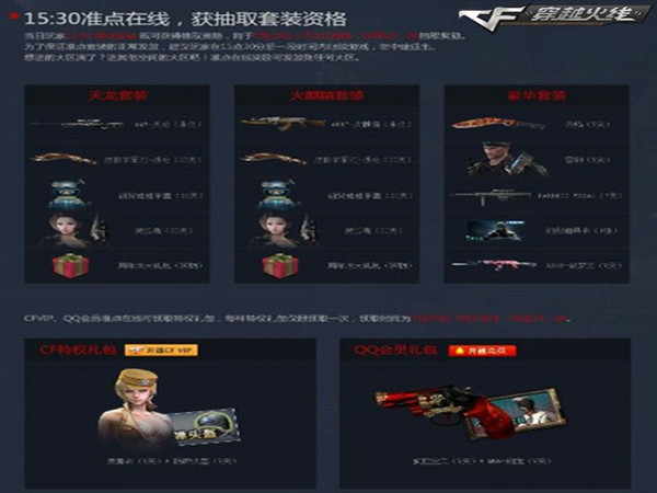 除去以上两种活动,7月28日15:30的准点游戏在线才是狂欢高潮,玩家在规定时间在线游戏后既获得抽取套装资格。本次活动的三大套装分别是天龙套装、火麒麟套装、豪华套装。