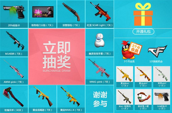 除此之外,每个用户把每天的玫瑰献给心爱的女神,还可获得一次道具抽奖机会。更有会员礼包,独享黄金系列、茉莉AK47等精品道具。