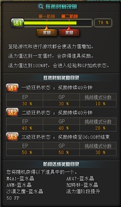 当活力值到达100%时,会进入狂热状态,享受GP和经验加成。狂热状态共分3个等级,等级越高所获得GP和经验加成越多!(在游戏大厅中停留200分钟,活力值可达到100%,但在游戏状态下约66分钟活力值即可达到100%,两种方式获得的活力值可以叠加)