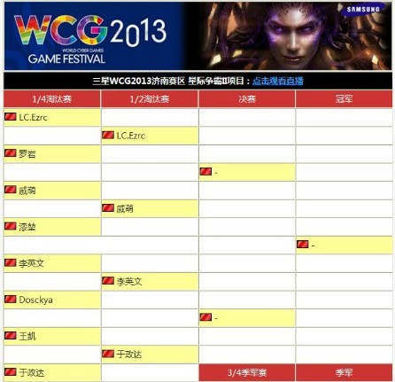 三星WCG2013中国区锦标赛济南赛区选手对阵已经出炉,比赛将于2013年8月10日-2013年8月11日于济南市历下区山大北路山东大学中心北门对面 VTOPNET山大北路店开赛。对阵详情如下: