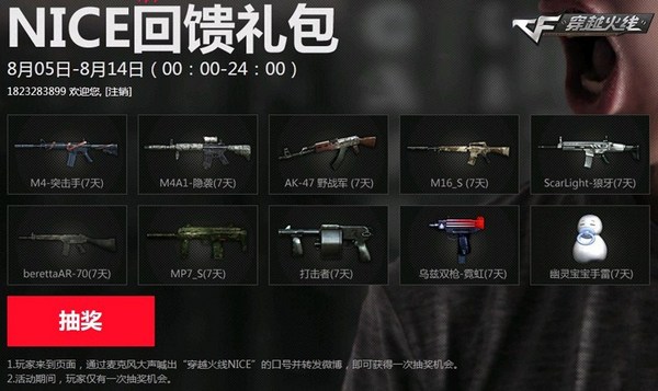 放声大喊、分享激情之后,CF还有NICE回馈礼包送上,成功分享微博的玩家立即获得一次抽奖机会,可在活动页面抽得M4-突击手、AK47-野战军、幽灵宝宝手雷、乌兹双枪-霓虹等给力游戏道具。相信在这些实用游戏道具的助力下,玩家们的《穿越火线》会更加NICE!