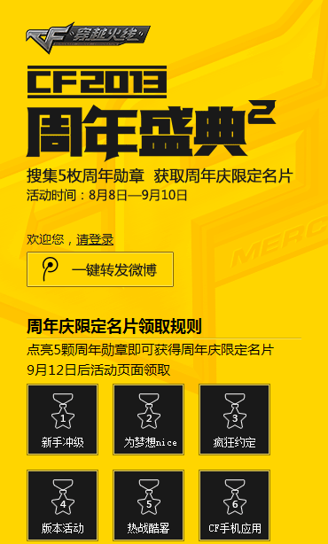"喜迎5周年,疯狂赢大礼"《穿越火线》CF2013周年盛典第二波活动将于8月12日-8月30开启。搜集周年纪念勋章赢取周年庆限量名片,你还在等什么呢?