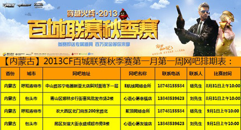 亲爱的玩家们,随着春季赛的结束大家休息调整了一段时间,紧接着秋季赛又到来了,2013年CF百城联赛秋季赛的帷幕将在本周8月31日-9月1日就要拉开,此次比赛将在呼和浩特和包头市两地举行,并且本次比赛得到了可口可乐公司的大力赞助,本次秋季赛我们为大家准备了很多的游戏道具,参赛即送游戏专属道具,百万奖金等你来拿,我们本着“玩就要玩痛快,周周有比赛,月月有冠军,人人有奖品“的宗旨,期望为广大CF玩家们打造一个完美的2013年CF百城联赛秋季赛,你准备好了么,那就赶紧来参加吧,我们期待您的到来!