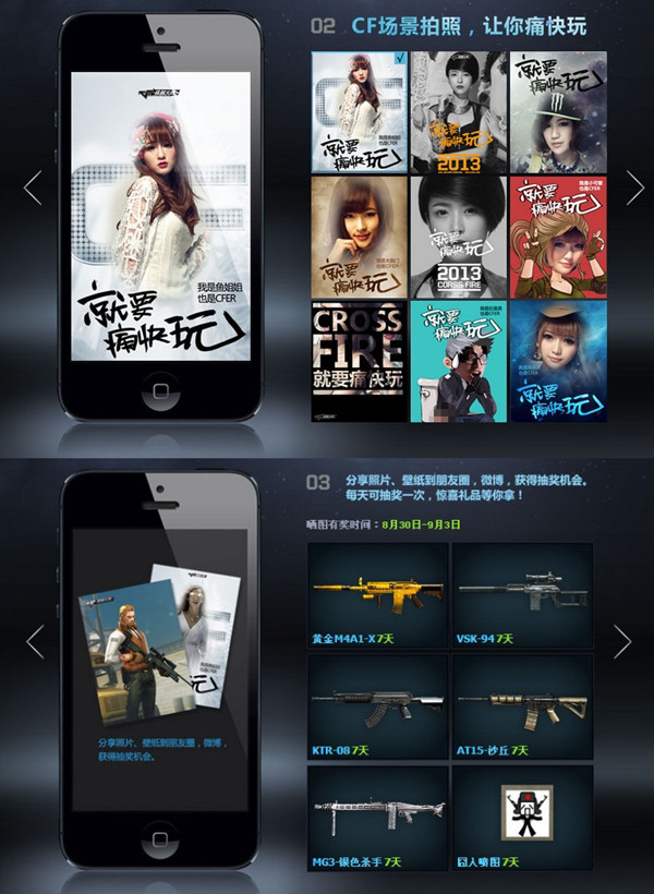 CF就要痛快玩手机APP设置了海报、壁纸、抽奖、分享四个分栏。在海报一栏,软件列出了多张以“就要通快玩”为主题的相框,其中多张CFGirl美女选手,可以满足各种挑剔的玩家的胃口。玩家选择好一张心仪的相框,拍摄一张自己的头像,分享到朋友圈、微博,即可参与道具抽奖,黄金M4AQ-X、VSK-94以及大受欢迎的激枪MG3-银色杀手等多种实用道具等待玩家领取。