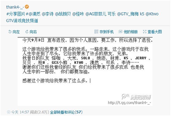 在WCG2013即将开始前夕,前摩登电竞、倾城电竞、EP.Cherry的狙击手 thank4付志海选择了退役,因个人原因离开了拼搏多年的穿越火线,而在前不久结束的WCG2013济南分赛区的比赛中,Thank4与老将大米率领的佳乐电竞夺取了冠军成功晋军WCG2013全国总决赛,此前thank4也曾因为学业离开了EP.Cherry失去了CFPL S4的参赛机会而此次彻底退役之际,他也发表了对曾经老队友的离别感谢,在这里FPSTT也祝愿这位曾经以快著称的狙击手今后事业顺利家庭幸福!
