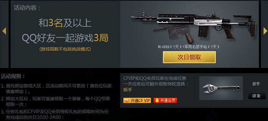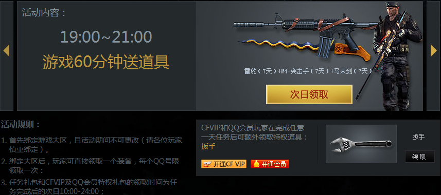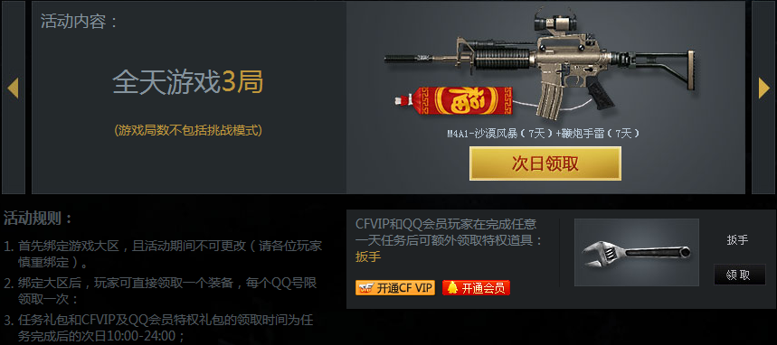 3.任务礼包和CFVIP及QQ会员特权礼包的领取时间为任务完成后的次日10:00-24:00;