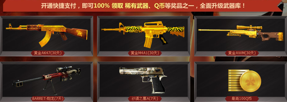 4.本次活动奖品包括:黄金AK47(30天)、黄金M4A1(30天)、黄金AWM(30天)、BARRET-翔龙(7天)、沙漠之鹰A(7天)、最高100Q币。