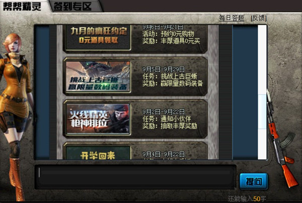 “M4A1不会玩?总是错过CF的各种精彩活动?新版本特色一无所知?”玩家在遇到类似的问题常常不知所措。如今,集问答服务、游戏资讯、回馈活动的CF帮帮精精灵灵已经上线,此类问题都将迎刃而解。同时,玩家还能每日签到赢取精品道具。