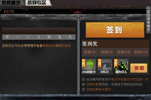 伴随着游戏帮帮精精人气飙升,签到专区的送道具活动也随之火爆。每当玩家签到2日、5日、10日或17日,即可领取相应的道具奖励,火鹰手斧、防弹衣、闪光护目镜等实用道具。每天都会送出大量的道具,还在等什么?赶快参与进来。