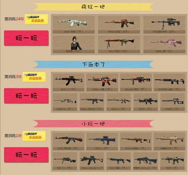 在活动期间,玩家可以通过自己手中的乐透券在活动页面参与抽奖。本次抽奖环节分为“疯狂一把”、“下血本了”以及“小玩一把”三个档次,分别消耗的奖券数量为24张、3张、1张;当然投入越大收获也会越大。三个档次适合各类玩家参与,此次活动的奖品不但有AK野战军、迷彩狙击、翔龙巴雷特、茉莉AK等给力道具为玩家呈现,更有30天的美丽夜玫瑰、战龙M4、MG3—翔龙等极品装备为CFer准备。