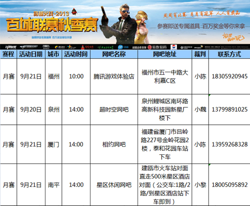 近期赛点城市分别为:九月份:福州、厦门、泉州、南平十月份:福州、莆田、龙岩、漳州