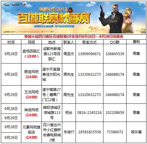 周周有比赛,月月有冠军,人人有奖品!穿越火线百城联赛又一次激战袭来。四方战士怀揣着冠军梦想重返战场,为自己的光荣之路前进!荣誉、激情、友情,尽在2013年百城联赛秋季赛,娱乐赛个人枪王、狙神战带你玩转百城联赛。你还在等什么?兄弟们,战起来!