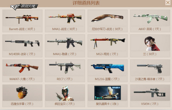 10月9日到10月27日期间,玩家在沙漠风暴地图中完成五局游戏或者胜利一局便可以在次日活动开启战龙宝箱领取奖品。战龙宝箱中不但有茉莉AK、中文女角色兰、迷彩M14EBR、M4A1—隐袭等各种给力道具,同时战龙家族的战龙M4、战龙大炮、战龙尼泊尔等三件给力武器也来助阵,凡抽中战龙的玩家便可独占战龙武器30天,让你带着战龙名枪驰骋沙场成为场上焦点。