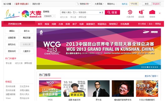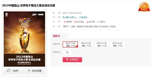 全球最具影响力的电子竞技赛事——WCG2013世界区总决赛将自2013年11月28日-12月1日在中国昆山举行!想亲临现场观看各国选手的巅峰对决的粉丝们,请点击大麦网售票页面网址:http://www.damai.cn/ticket_57055.html 火速购票吧! 购票活动10月12日正式开启。