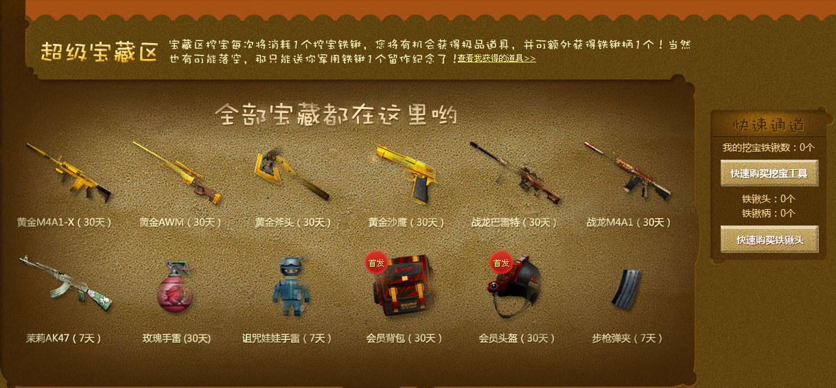 4.宝藏区挖宝每次将消耗1个挖宝铁锹,您将有机会获得极品道具,并可额外获得铁锹柄1个!当然也有可能落空,那只能送你军用铁锹1个留作纪念了!