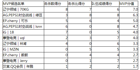 本次MVP评选以三个方面进行考量,分别为击杀**杀比以及队伍成绩得分进行核算,这三项数据只有排名前八的队员可以赢得积分(第一名8分,第二名7分,依次递减,未进入单项数据前八则计0分,在这样的评判标准下,来自辽宁倾城的70KG分别获得了8分、7分、6分,最后的MVP分值为7分(三个数字相加除以3),领先了第二名AG.PEPSI.时空战线的选手绿豆0.7分。