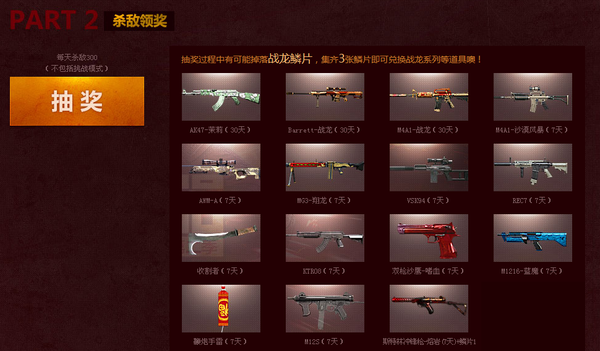 活动期间,玩家每天达到300杀敌数即可于次日10:00-24:00获得一次日常抽奖机会,不包含挑战模式;