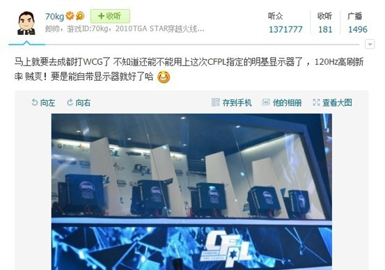 而不论是CF超级明星70KG,还是2012CFPL全国总冠军林肯都对明基游戏显示器的效果和功能表示肯定与支持,甚至70KG还在他的微博中大赞明基游戏显示器的超高120Hz刷新率,并表示以后希望自己能带喜欢的明基游戏显示器去各大比赛现场。