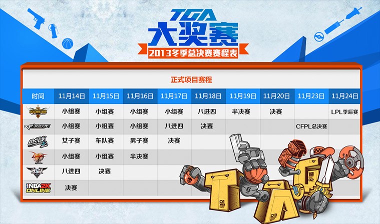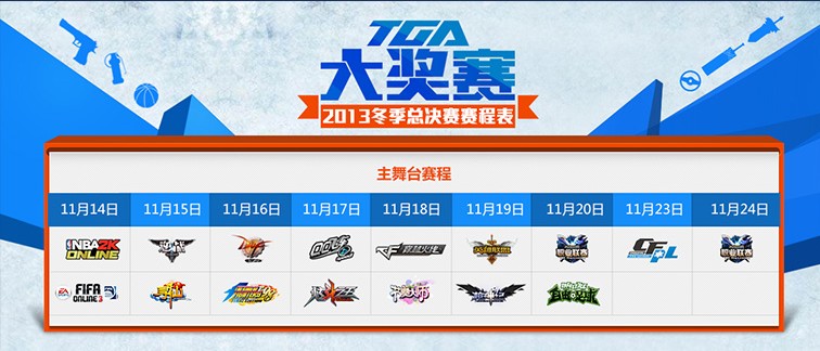 TGA大奖赛2013冬季总决赛官方网站正式上线啦!11月14日起,TGA大奖赛2013冬季总决赛正式开幕!LPL夏季赛季后赛、LOL城市英雄争霸赛、CFPLS4总决赛、DNF格斗大赛总决赛、QQ飞车SSC总决赛等8大赛事,以及14项表演赛将悉数登场!火爆赛事席卷而来,竞技热情就此点燃!
