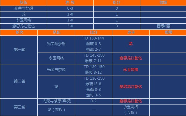 目前已经晋级8强的队伍:意思龙江乾亿(A组)、紫瑞(B组)、_1ng、战队(C组)