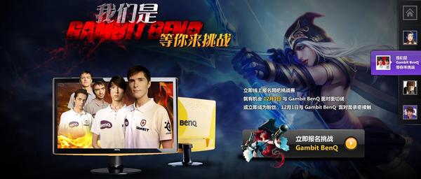 当然除此之外,明基还准备了丰富多彩的互动活动等你参与,其中有“Gambit BenQ 等你来挑战”,玩家可进入活动页面报名参与线上网吧挑战赛,就有机会与12月1日与Gambit BenQ 面对面切磋,或立即成为粉丝与Gambit BenQ亲密接触!