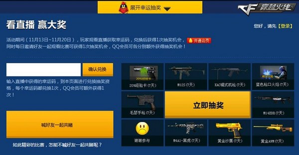 CF百城联赛总决赛因为地域广阔、参与人数众多,因而历届赛事都引起热烈反响。同时,作为TGA大奖赛的重要项目,QQ会员联合CF官方也围绕CF百城联赛总决赛组织了一系列的抽奖回馈活动。例如提醒玩家准时观战的预约活动、为喜爱的战队加油的助威活动、邀请好友一起看直播的战友活动等等,CFer在完成这些简单的活动之后,就可以抽取包括黄金AWM、黄金沙漠之鹰、M4A1-黑虎、20%经验卡在内的给力游戏道具。让玩家在享受电竞盛宴的同时,还能充实自身的“军火库”。此外,在以上活动中,QQ会员用户均可获得额外一次的抽奖机会。
