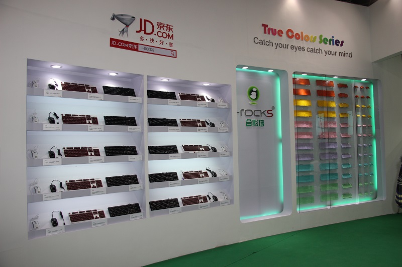 艾芮克展台内部都设有产品展示区,展示了包括此次发布的新品EP套装、MISS套装和小苍套装在内的一系列产品。除了新品之外,泡在水中的防水板IK10键盘和马卡龙键盘墙都吸引了不少观众的目光。