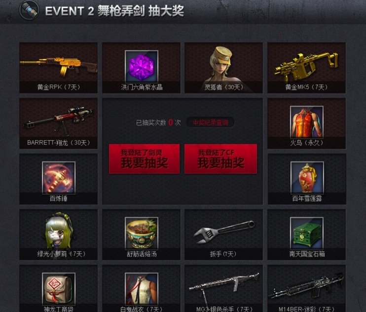 活动期间,玩家登陆剑灵即可获得两次抽奖机会,登陆CF可获得一次抽奖机会;奖池包含了两款黄金枪:黄金RPK和黄金M5以及翔龙-巴雷特(30天)和灵狐者(30天),更有永久时装火鸟和极品紫色六角宝石等你来拿。