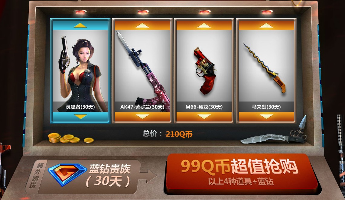 1活动期间可分别在道具池A、B、C、D各选一种道具,并加上蓝钻(30天)组成一个超值道具包。