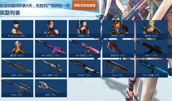 3.活动期间累计6天,每天在<胜利广场>获得一局胜利可直接领取灵狐者套装(灵狐者7天、AK47-紫罗兰7天、玫瑰手斧7天),每个QQ号仅限领取一次