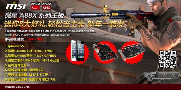 2013年12月15--2014年1月15日,购买任意微星A88X系列主板加上AMDA106800KCPU或者A86600KCPU套包,凭主板&CPU产品序列号,登陆活动网站(a88x.cn.msi.com)即可参加抽奖,100%中奖。