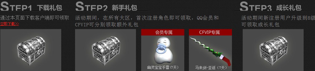 3.通过本页面下载游戏可以领取礼包,活动期间注册游戏的新用户可以领取对应礼包,并且QQ会员和CFVIP都可以领取对应道具。活动期间新注册用户升级到8级可领取对应礼包。