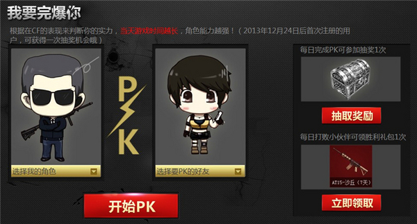 活动期间,玩家在活动页面绑定大区之后,每日通过参与游戏选择好友PK,获胜之后即可领取“胜利礼包”1次,疯狂宝贝、MG3-翔龙、AT15-沙丘等8种给力道具任玩家选取;而决定角色实力的则是当天的游戏时长,游戏时间越长则角色能力越强,获胜几率也就越大。2013年12月24日后首次注册的用户还可额外获得抽奖机会,助力CF新玩家热战这个冬天。