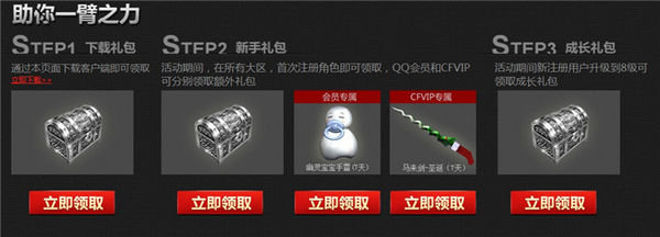 新年伊始,CF再次送出海量礼包。玩家通过活动页面下载客户端可领取“下载礼包”;活动期间,玩家在所有大区首次注册角色即可领取“新手礼包”,QQ会员和CFVIP用户还可分别领取相应的额外礼包;活动期间新注册用户升级到8级还可领取“成长礼包”。三大礼包放送不停歇,灵狐者、M4A1-轻骑兵、雷豹、毒蛇面具等道具领不停。