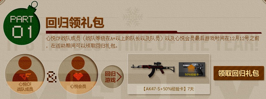 心悦CF战队成员(战队等级在A+以上的队长以及队员)以及心悦会员最后游戏时间在12月12号之前,在活动期间可以领取回归礼包。